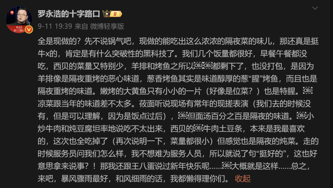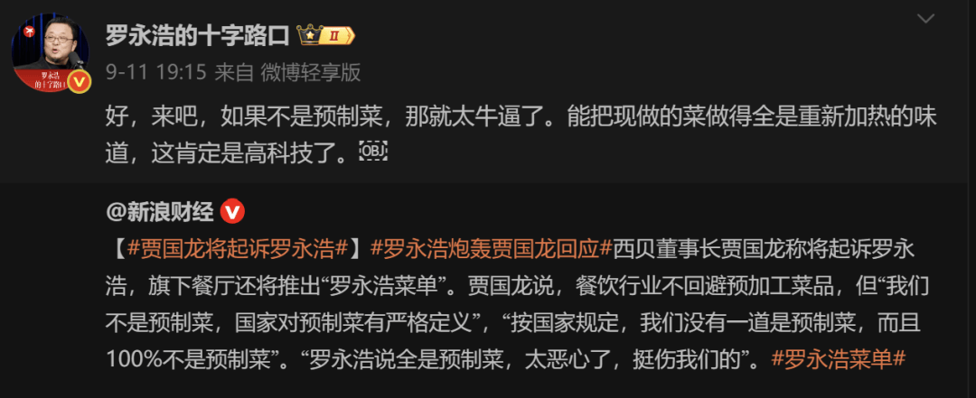 9月10日薄暮,罗永浩正在微博上一句“几乎全都是预制菜,还那么贵,他讲述本人和同事正在西贝就餐的履历,婉言菜品“贵”“恶心”“预制”,并抛出“国度应立法强制标明预制菜”的呼吁。短短几个小时,这条微博被不竭转发,评论区几乎成了消费者餐饮行业“猫腻”的公开场合。西贝创始人贾国龙火速回应,称“西贝门店没有一道是预制菜”,强调“地方厨房配送原料”取“预制菜”不是一回事,并正在官网和号同步发出致顾客信,公开13道被质疑菜品的制做流程。这一回应不只没能平息质疑,反而被不少网友认为“”。