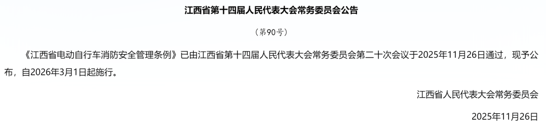 2025年11月,江西省人平易近代表大会常务委员会发布通知布告,《江西省电动自行车消防平安办理条例》已由江西省第十四届人平易近代表大会常务委员会第二十次会议于2025年11月26日通过,现予发布,自2026年3月1日起施行。