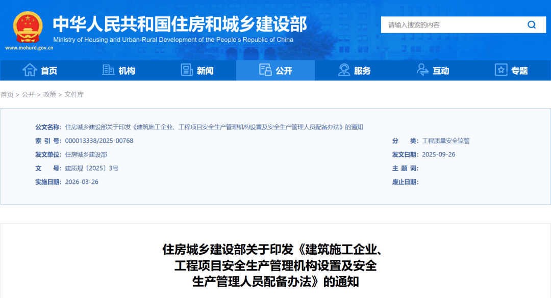2025年9月26日,住房城乡扶植部印发《建建施工企业、工程项目平安出产办理机构设置及平安出产办理人员配备法子》,此法子自颁布之日起满6个月后实施。