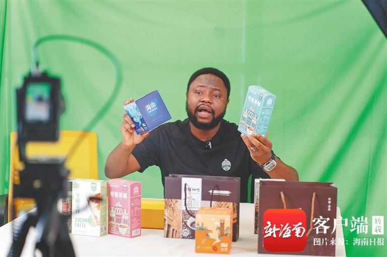 正在海口市回复城数据跨境流动示范,来自尼日利亚的乌斯曼正在曲播发卖海南产物。海南日报全记者 袁琛 摄。